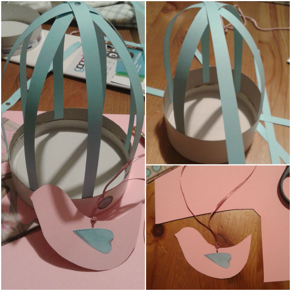 Κόβουμε μια μικρή λωρίδα από το χρώμα που έχουμε κάνει τα κάγκελα και φτιάχνουμε ένα κρεμαστάρι, το βάζουμε στο πάνω μέρος του κλουβιού, ώστε να καλυφθεί και η κορδέλα που προεξέχει.