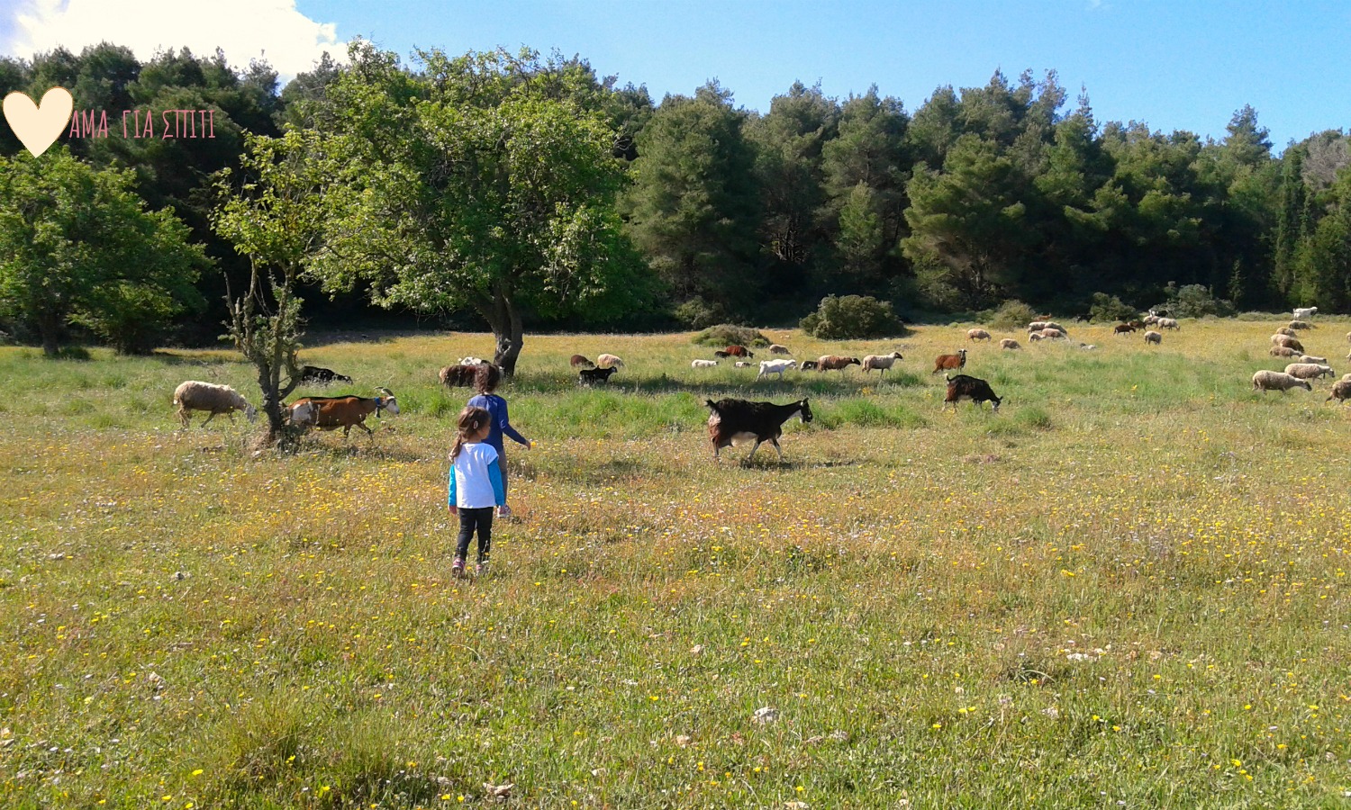 Μετά ανηφορίσαμε στο χωριό… Ξαφνικά βρεθήκαμε στον παράδεισο: κοτούλες και κοτοπουλάκια, γαλοπούλες, χήνες και πάπιες, κουνέλια και μικρούτσικα κουνελάκια, κατσικούλες και ένα γουρουνάκι, μαζί με σκυλάκια, γατούλες και όλα τα σχετικά. Μέχρι εκεί που έφτανε το μάτι ελιές και αμπέλια. Τα παιδιά ξεσάλωσαν, περιττό να το πω.